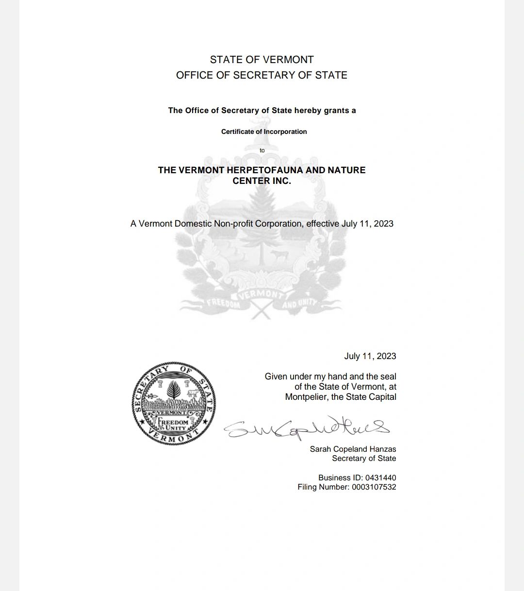 The Vermont Herpetofauna and Nature Center IRS assigned EIN as a non-profit organization: 93-2297095
